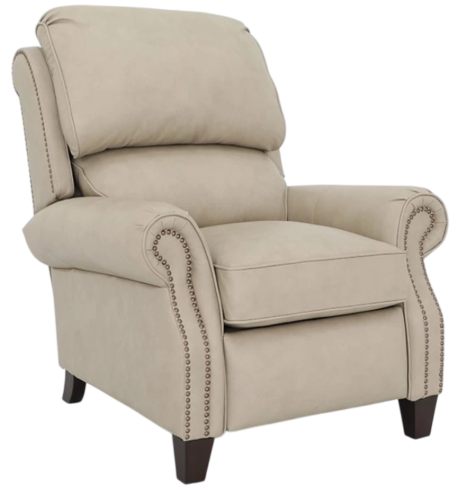 Classic pub back 3-way low leg recliner with kneed back rolled arms accented with nail head trim. Luxurious comfort is enhanced with adjustable zippered upper and lower back pillows. Loose-welted boxed seat cushion with pocketed coil springs encased in foam wrapped in Dacron with a down blend topper.Read More