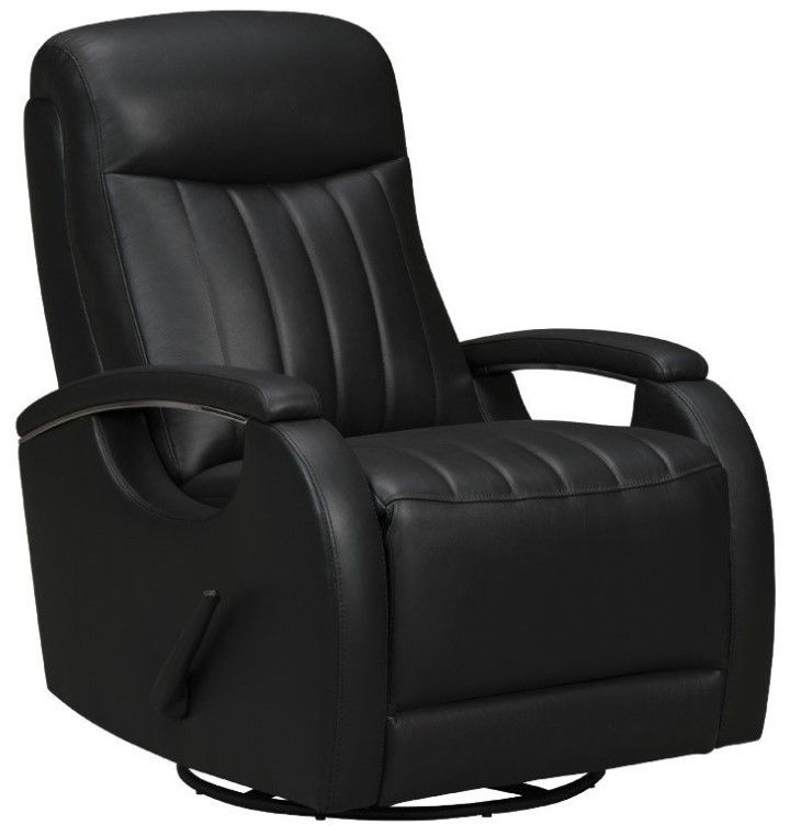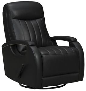 Modern open track arm design, 360-degree swivel glider recliner with handle activated recline. 4” channels on the seat & back, pad over chaise seating with pocketed coil springs, and plushily padded headrest and footrest for outstanding reclining comfort. Chrome accents under the arm pads and single needle top stitching thru out.Read More