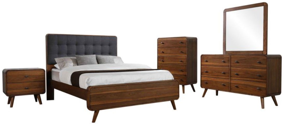 Transform your bedroom into the ultimate retreat with this mid-century modern bedroom set. Expertly crafted from pine, engineered wood, and walnut veneer, the set includes a bed, nightstand, dresser, mirror, and optional chest for a cohesive look. Rounded edges, tapered legs, and square tufting lend a retro-inspired flair.Read More