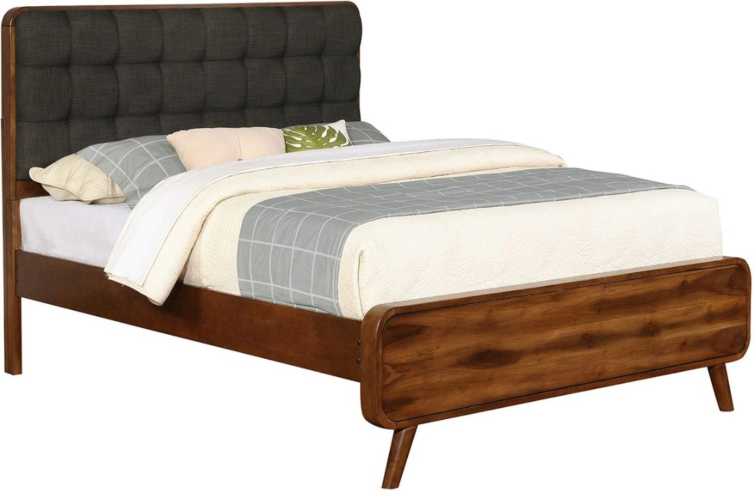 Bring countryside charm to your bedroom with this mid-century-inspired bed, expertly crafted from pine, engineered wood, and walnut veneer for durability and style. The upholstered headboard features thick padding and square tufting for a touch of elegance and comfort, while the sleek, low-profile footboard completes the refined silhouette.Read More