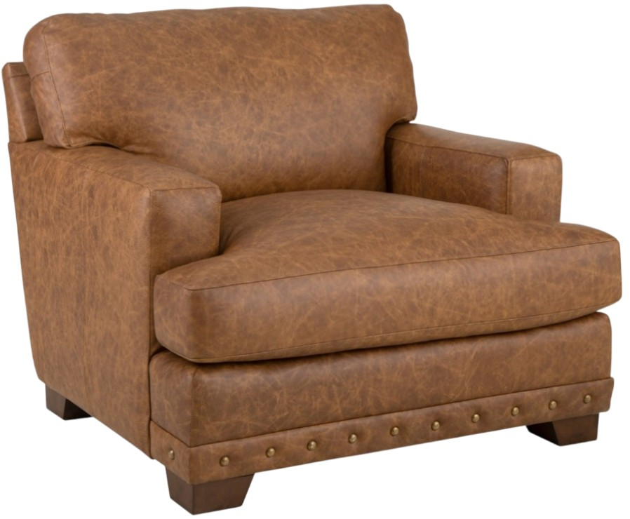With architectural shaping and bold nail head detailing, this leather chair and a half has a casual appeal as well as amazing comfort. Deep seated, and generously scaled, there is plenty of room to relax. It features semi-attached backs, Blend down coil cushions, and track arms.Read More