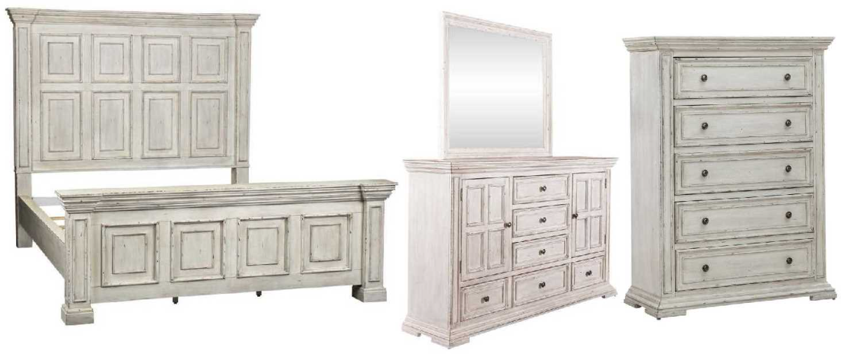 ive life beautifully with the Big Valley king panel bed, dresser, mirror, and chest. Crafted of rubberwood solids with wood products, this kit features a whitestone finish with heavy distressing, wood framed doors and drawers, graduated bead molding creating architectural interest, square pilasters and block feet.Read More