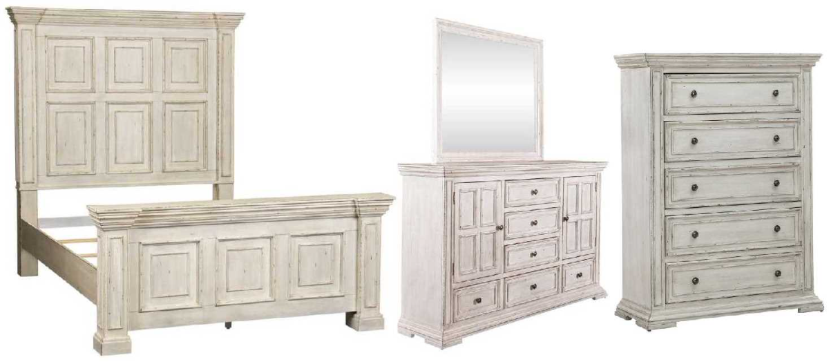 Live life beautifully with the Big Valley queen panel bed, dresser, mirror, and chest. Crafted of rubberwood solids with wood products, this kit features a whitestone finish with heavy distressing, wood framed doors and drawers.Read More