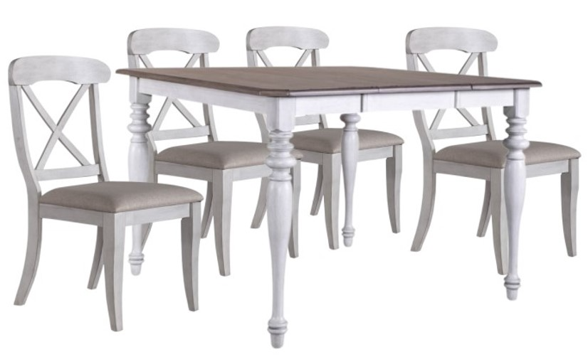 Warm and cozy. Bring beauty indoors with the Ocean Isle five-piece gathering table set. Crafted of rubberwood solids with New Zealand pine veneers, this set features an antique white and weathered pine finish and consists of four upholstered X back counter height chairs and a gathering table.Read More
