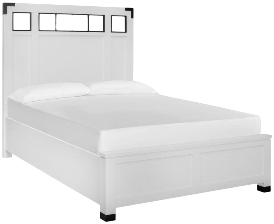 Black metal ferrules, corner brackets and forged iron hardware bring an industrial modern vibe to the craftsmen-like silhouettes. A black metal bed and a black mirror with window-pane border provide a dramatic contrast to the soft silo white finish with rub-through and distressing. Harper Springs is crafted of random-width solid pine for an authentic and casual feel. Whether you aspire to loft living or country living, the harper springs collection will bring your dream home to life.