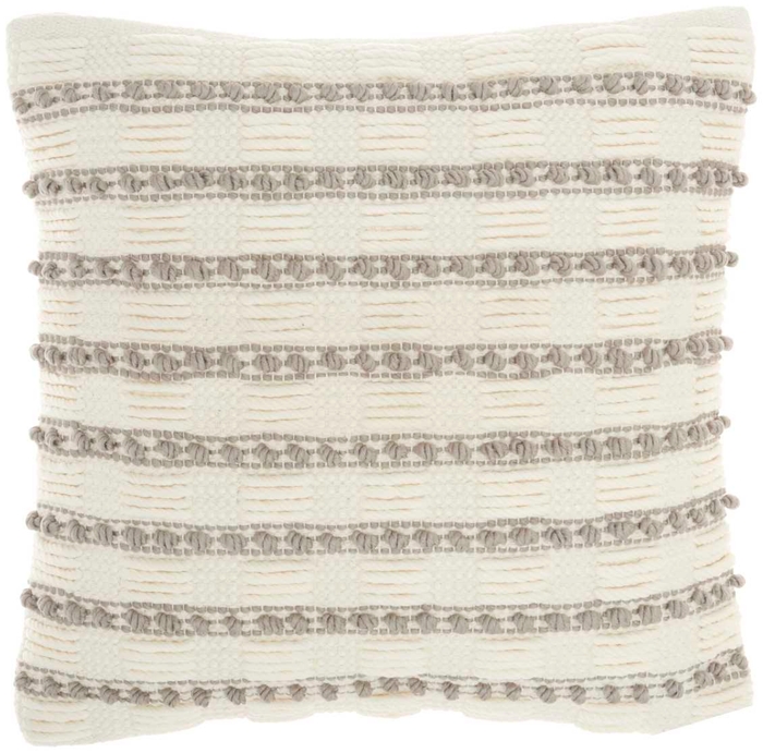 Charming and casual, this Mina Victory throw pillow easily ups the comfort level of your sofa or bed. Its softly textured poly-cotton cover is adorned with woven stripes and linear dots in light grey on a neutral ivory ground.Read More