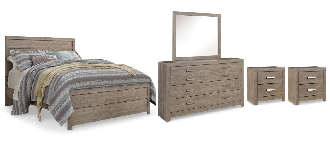 Includes queen panel bed (headboard, footboard and rails), 6-drawer dresser with mirror and two 2-drawer nightstands