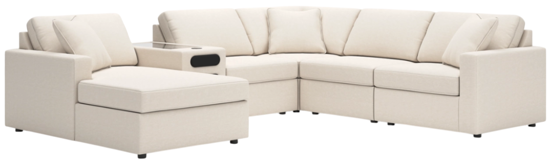 Includes 6 Modular Pieces: Left-arm facing corner chaise, audio console with storage, 2 armless chairs, wedge and right-arm facing corner chair