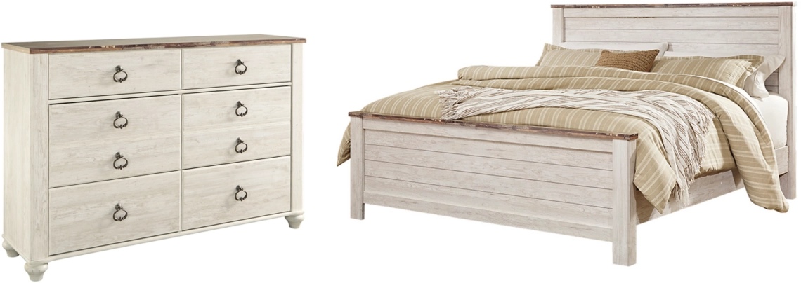 Includes king panel bed (headboard, footboard, rails) and 6-drawer dresser (mirror sold separately)
